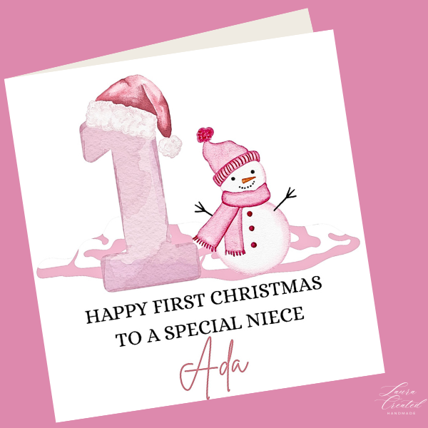 Celebrate a magical milestone with this adorable First Christmas card, lovingly designed to mark your little one’s very first festive season. Featuring a charming snowman, a Santa hat, and a large number β€œ1” in soft pink tones, this keepsake card makes a heart-warming gift for your special little one!